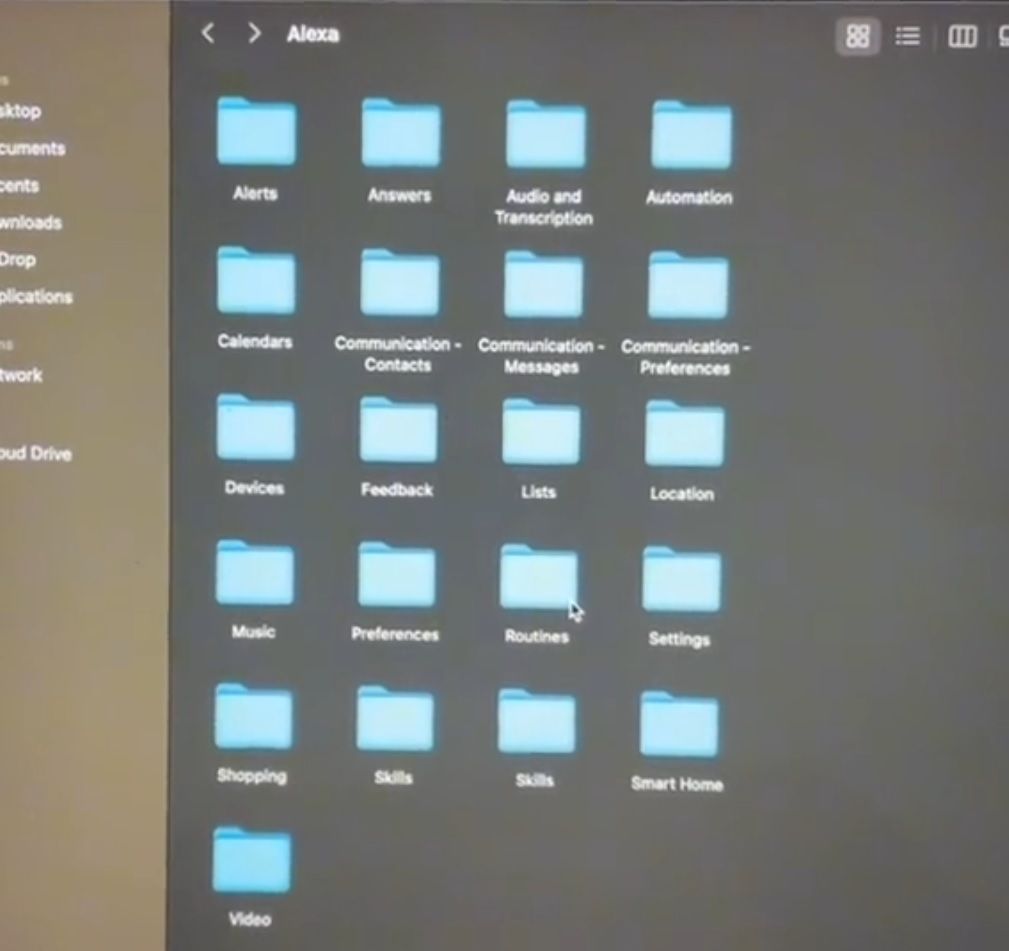 Na rede social, ela relata ter pedido à Amazon todos os dados que a empresa tem armazenado sobre ela e ao analisar o arquivo, encontrou registros auditivos de todas as conversas que teve com seus Echo Dots, todas as respostas dada pela Alexa, a transcrição de todas essas conversas, além de registros de alertas, calendários, lembretes, listas de mercado e outras listas criadas com auxílio da assistente pessoal, localização, músicas, preferências, configurações, dados de compras na Alexa, quais extensões foram instaladas e vídeos.