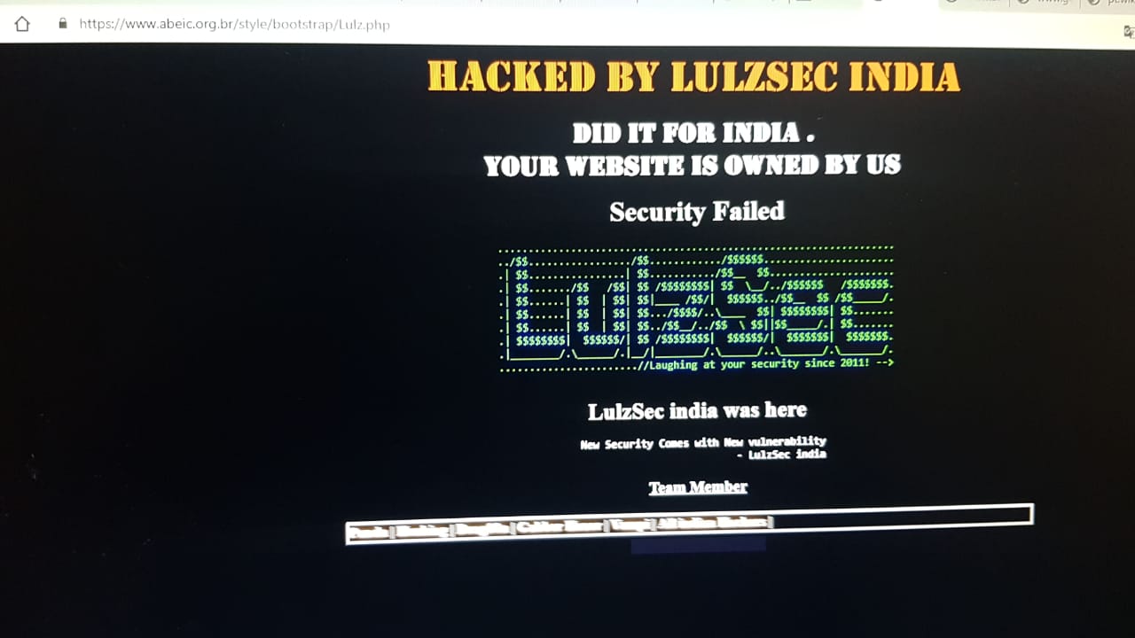 Basta acessar a URL (https://www.abeic.org.br/style/bootstrap/Lulz.php) para confirmar que o site já foi invadido pela equipe citada, que ainda assinou a “pichação digital” com os apelidos de cinco hackers.