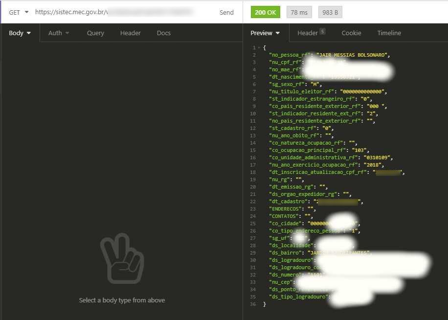 De acordo com diversos alertas enviados por diferentes pesquisadores à The Hack durante este último fim de semana, uma vulnerabilidade gravíssima presente no Sistema Nacional de Informações da Educação Profissional e Tecnológica (SisTec) do Ministério da Educação (MEC) expôs dados pessoais de um número incalculável de cidadãos brasileiros. O problema estava em uma URL específica: bastava utilizá-la em conjunto com o CPF da vítima para que a plataforma retornasse uma tabela completa com suas informações.