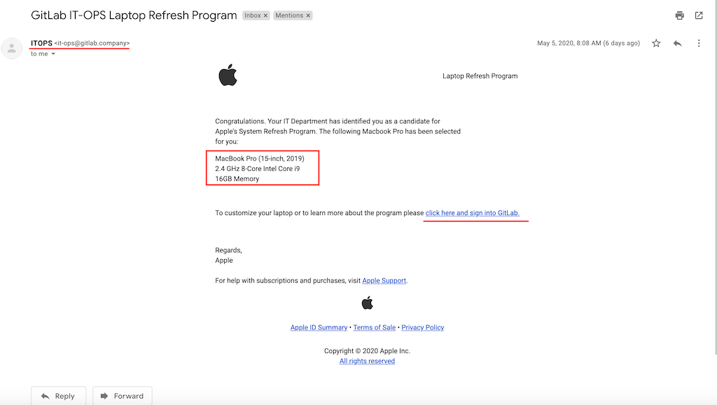 O exercício, que foi aplicado na última quarta-feira (20), simulou uma campanha maliciosa personificando a própria equipe de TI da companhia. O email, disparado pelo domínio “gitlab.company”, afirma que o funcionário foi escolhido para receber um upgrade de seu equipamento de trabalho. Bastaria clicar em um link e fazer login com suas credenciais para receber um MacBook Pro novinho de 15 polegadas, modelo 2019, com processador Intel Core i9 e 16 GB de memória RAM. Uma oferta tentadora.