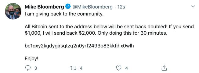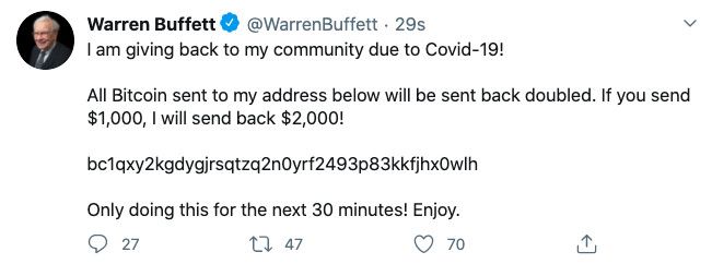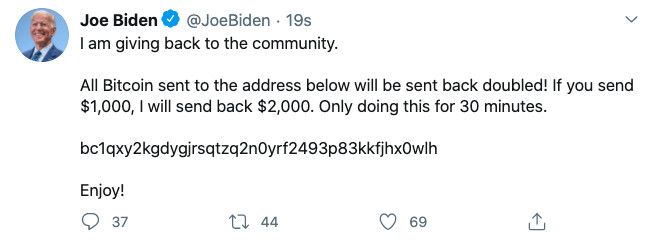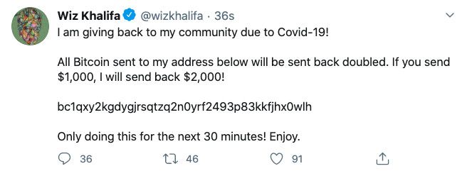 O fundador da Tesla parece ter sido a primeira vítima. No tweet malicioso, a conta de Musk publicou: “Estou me sentindo generoso por conta da COVID-19. Eu vou duplicar qualquer pagamento de BTC enviado para meu endereço BTC durante a próxima hora. Boa sorte, e mantenham-se seguros!”. Minutos depois, a postagem foi apagada e substituída por outra similar, indicando a mesma carteira de criptomoedas.